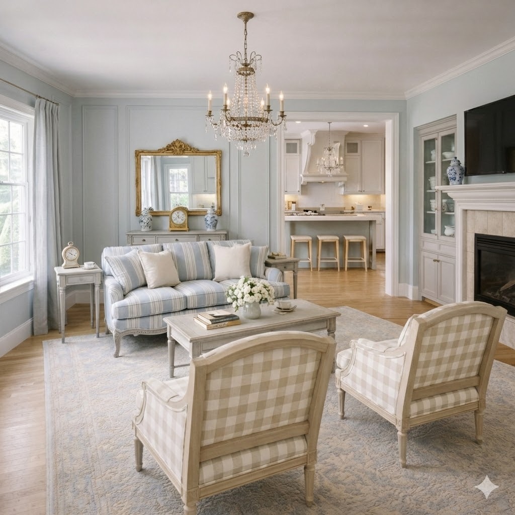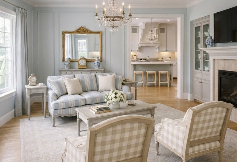 It is a light and refined interpretation of French Neoclassicism, featuring painted wood, muted pastel tones, elegant symmetry, and an airy Scandinavian sensibility.