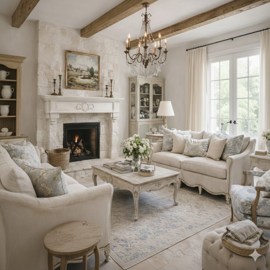 French Country (or French Provincial) style blends refined French elegance with rustic countryside charm, combining ornate details and humble materials to create a light, airy, and perfectly imperfect yet welcoming space.