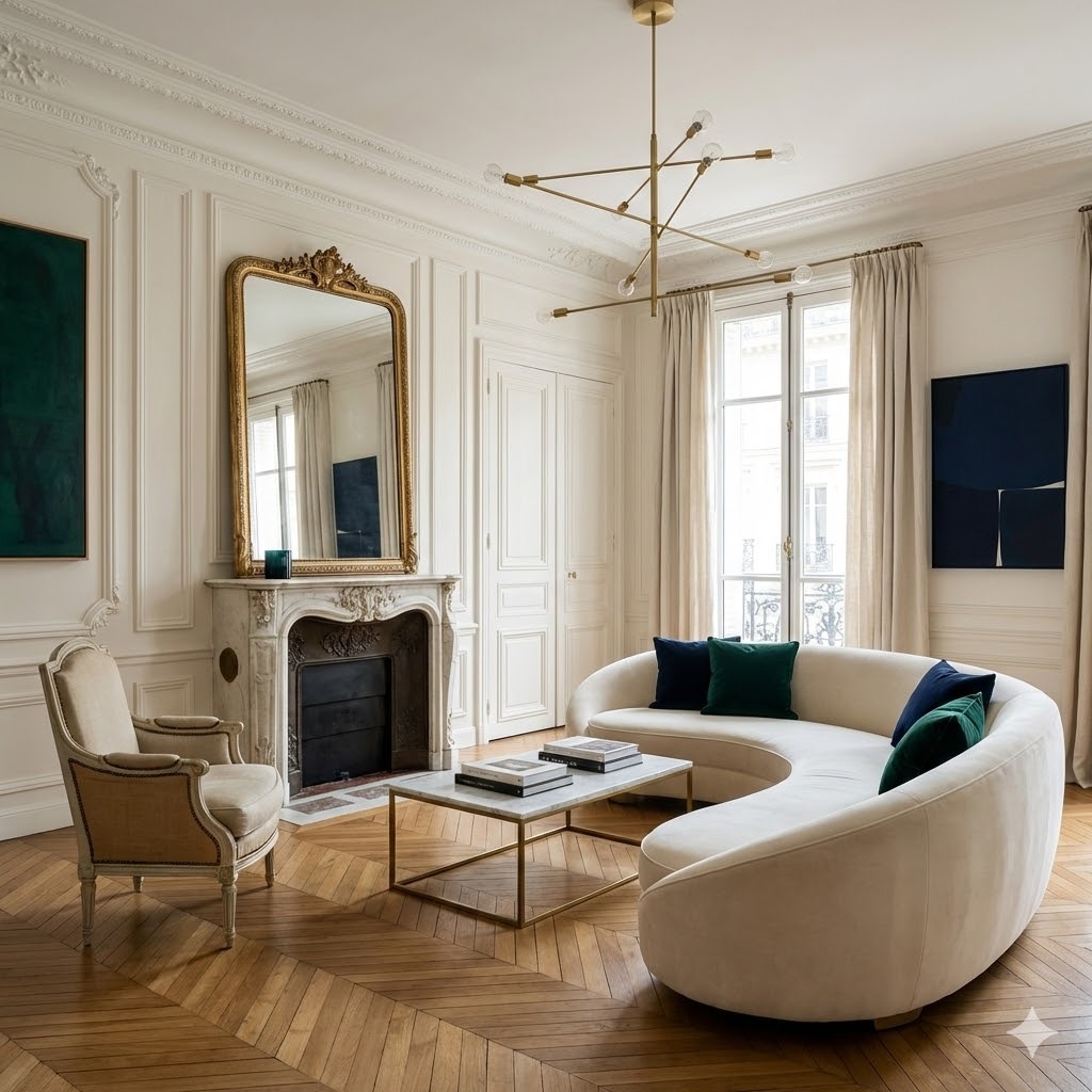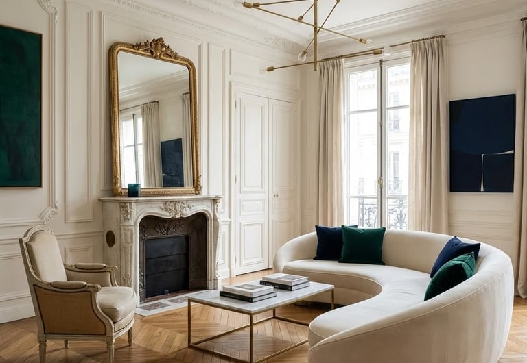 Parisian interior design is an elegant and effortlessly curated style that blends classical architectural details with modern pieces to create a timeless, refined, and lived-in atmosphere.