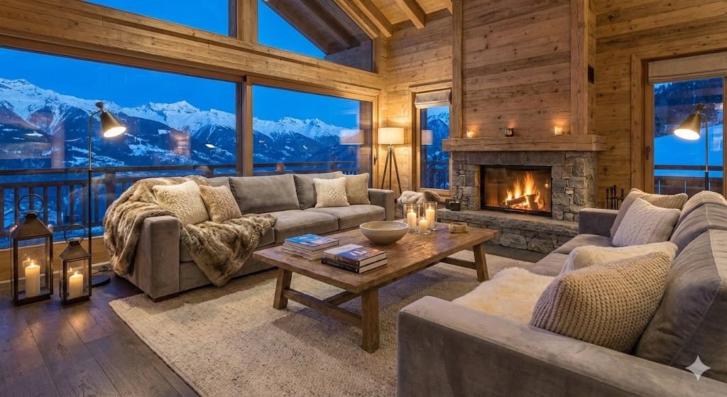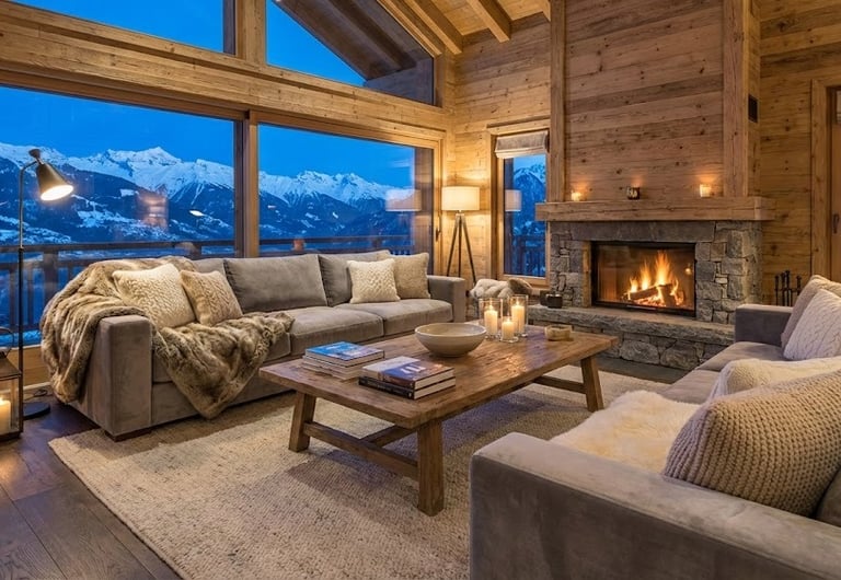 Alpine Chic (or Swiss Chalet style) is a refined and luxurious interpretation of mountain living that blends rustic Alpine materials with elegant European furnishings to create a cozy yet glamorous atmosphere.