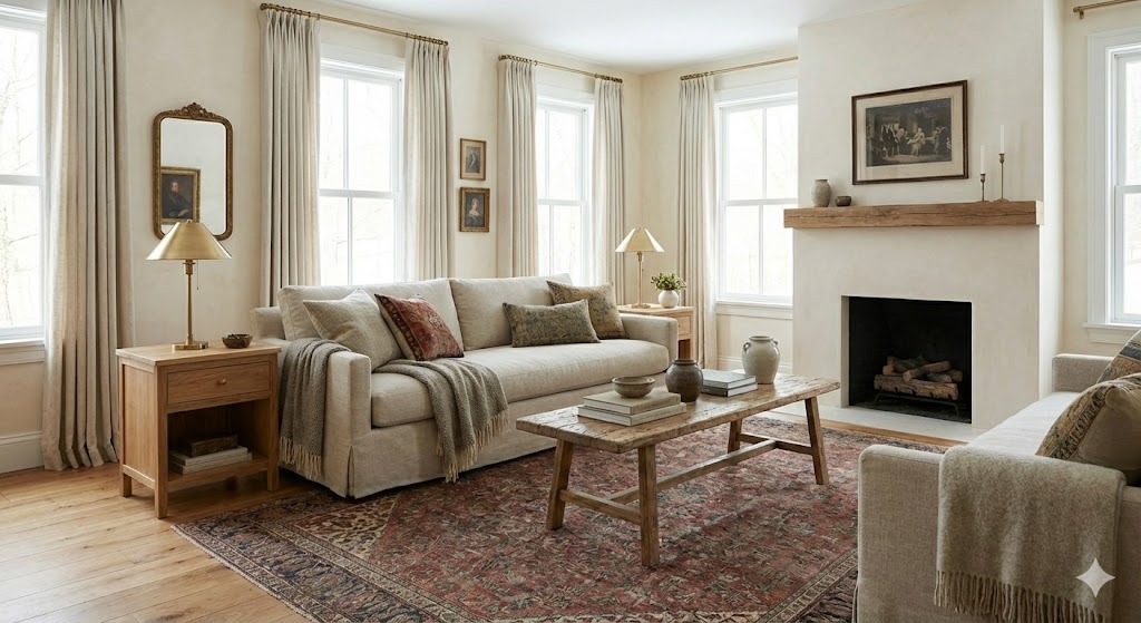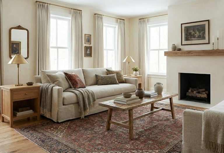 Style that blends historical charm and craftsmanship with modern functionality, celebrating natural materials, vintage pieces, and meaningful design that feels collected and personal rather than minimalist or overly uniform