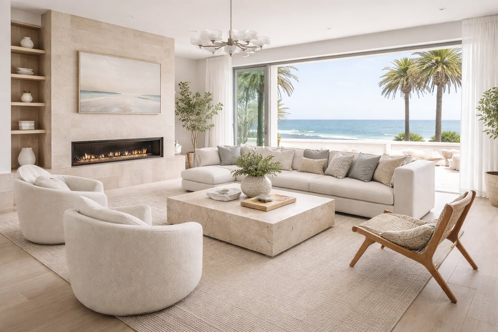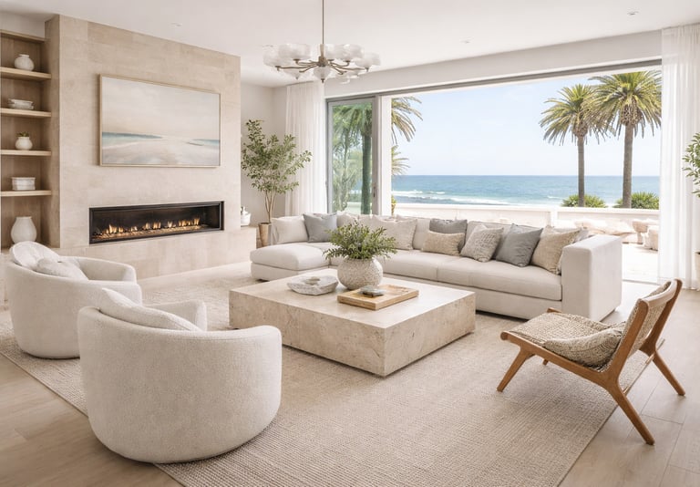 Coastal & California Coastal interior design is a light, airy style inspired by the seaside, combining natural textures, soft neutral tones, and relaxed elegance to create a fresh and effortless atmosphere..