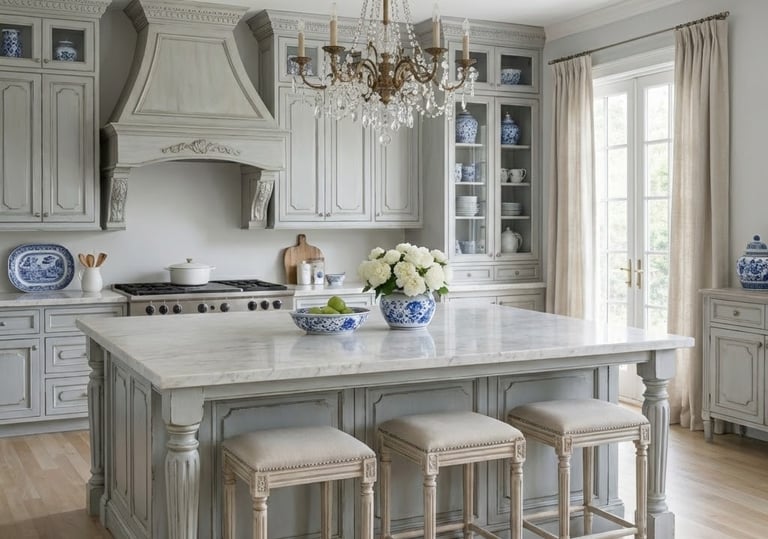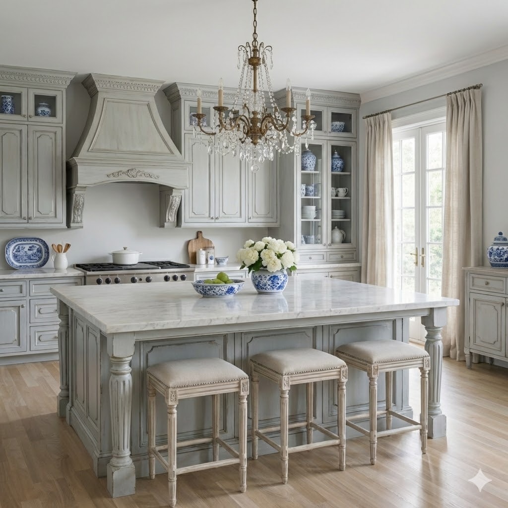 Painted Woodwork: The defining feature of the style. Wood surfaces are almost exclusively painted in muted, chalky shades of pearl grey, pale blue, or cream to keep interiors bright and fresh.