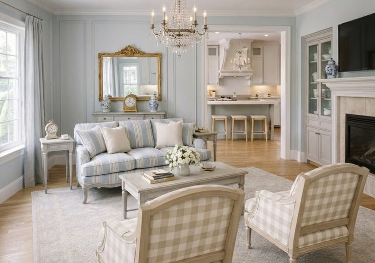 Simple Textiles: Upholstery and window treatments typically utilize natural linen or cotton. Traditional patterns like gingham, soft stripes, and subtle checks are preferred to maintain a casual yet sophisticated feel.