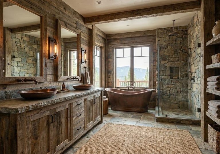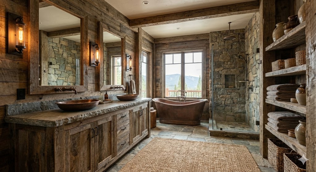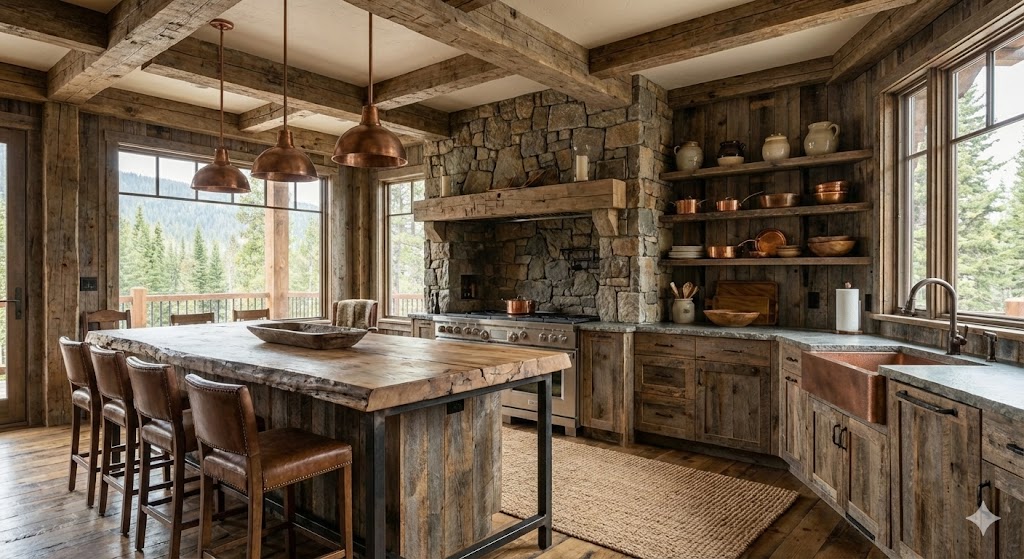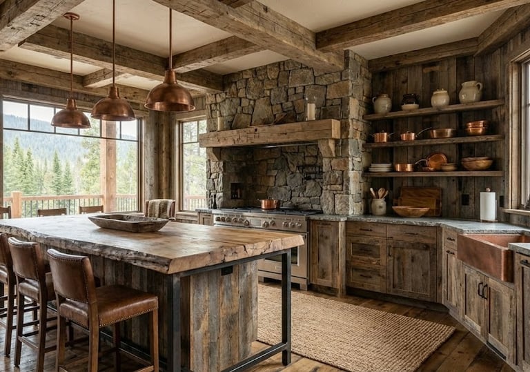 Weathered Wood & Stone: The hallmark of the style. Includes reclaimed wood, live-edge shelving, and exposed ceiling beams. Stone is used prominently in flooring or fireplace surrounds, often featuring irregular, natural shapes.