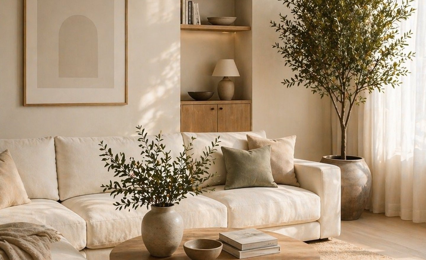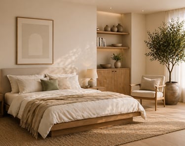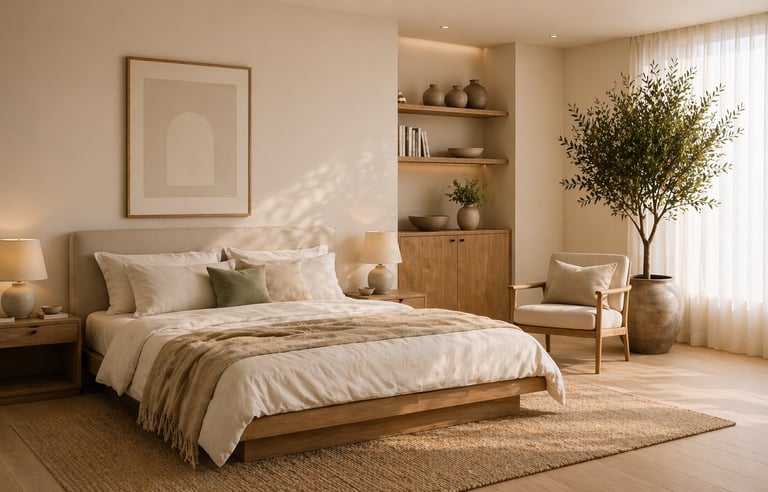 Natural Foundations: Light woods (such as white oak, ash, or walnut), linen, cotton, wool, and ceramic surfaces form the base of the room, emphasizing organic and tactile qualities.
